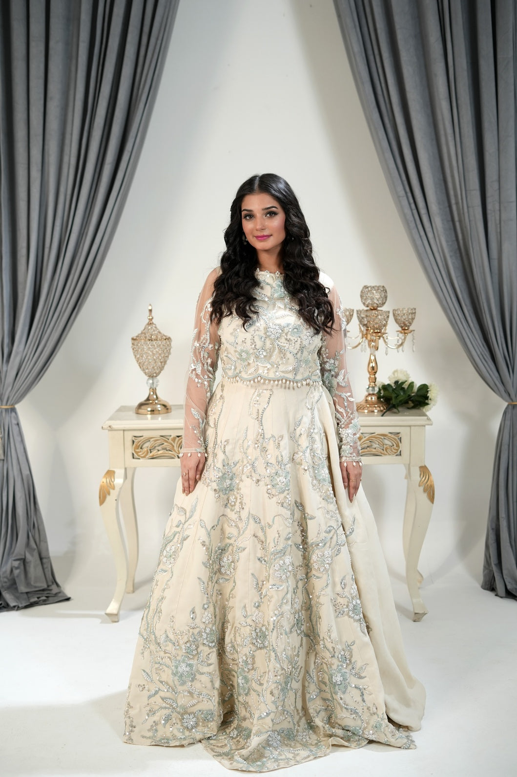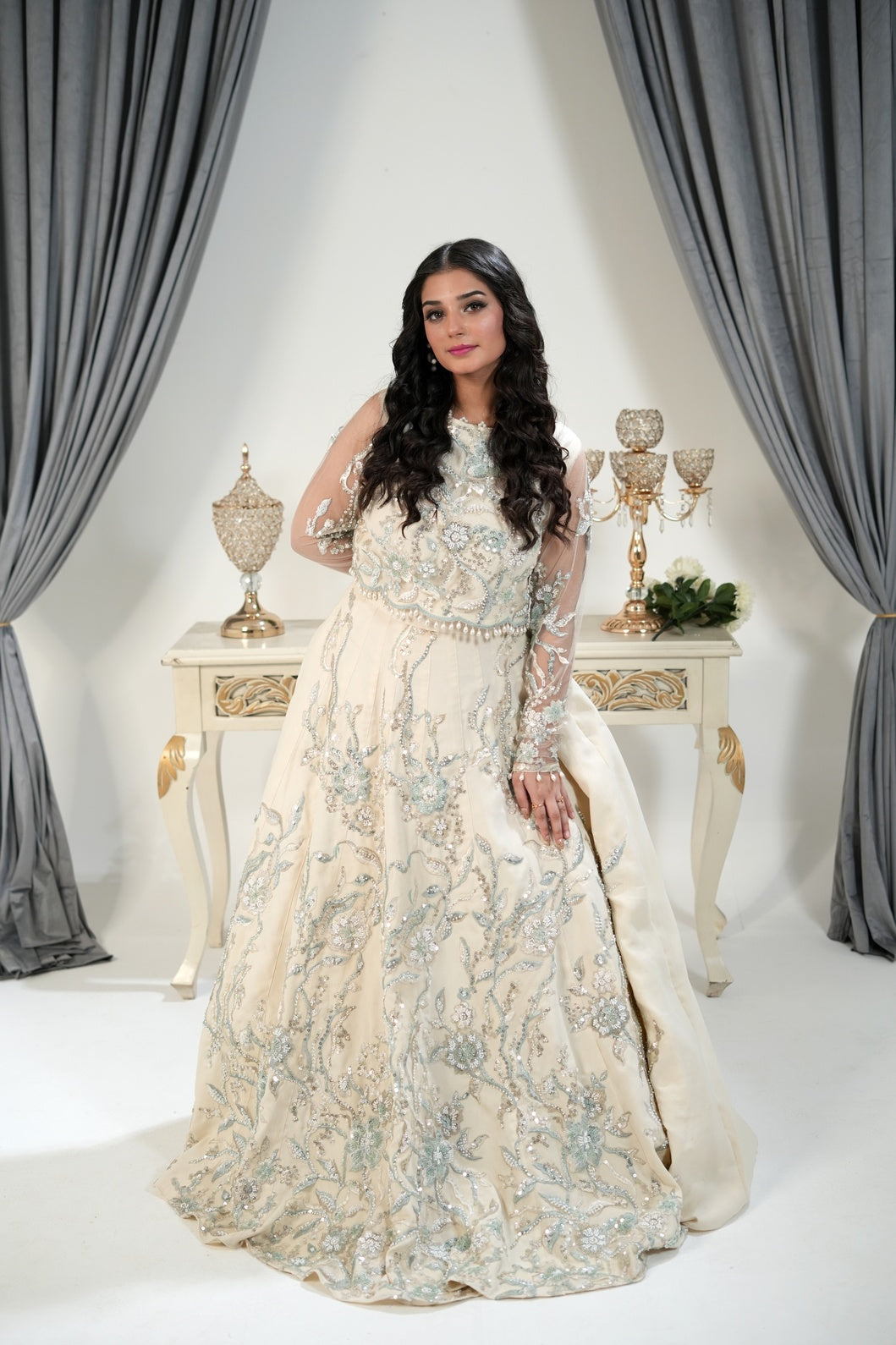 Zimal is a symphony of purity and quiet glamour. This two-piece lehenga-choli pairs a lustrous, shiny silk skirt with hand-finished embroidered net for the bodice and sleeves. Intricate threadwork, delicate sequins and subtle mirror accents catch the light without overpowering the silhouette, while a row of petite pearl-drop detailing along the choli hem adds a whisper of vintage romance. Designed as a semi-formal piece, Zimal sits gracefully at the waist and flows into a soft, elegant flare — ideal for daytime festivities or intimate evening gatherings.